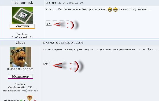 Chega Опубликовано 22 апреля, 2006 Жалоба Поделиться Опубликовано 22 апреля, 2006 кстати единственную рекламу которую смотрю - рекламные щиты. Просто она как правило с юморком. Ссылка на комментарий Поделиться на другие сайты Поделиться