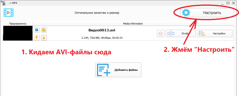 2. Долгий, с потерей качества, но более надёжный. Перекодируйте видеодорожку, например, в XviD через тот же XviD4PSP: добавляете видеофайл в список, указываете контейнер AVI. Для видеодорожки указывается кодек XVID, для аудиодорожки - COPY.